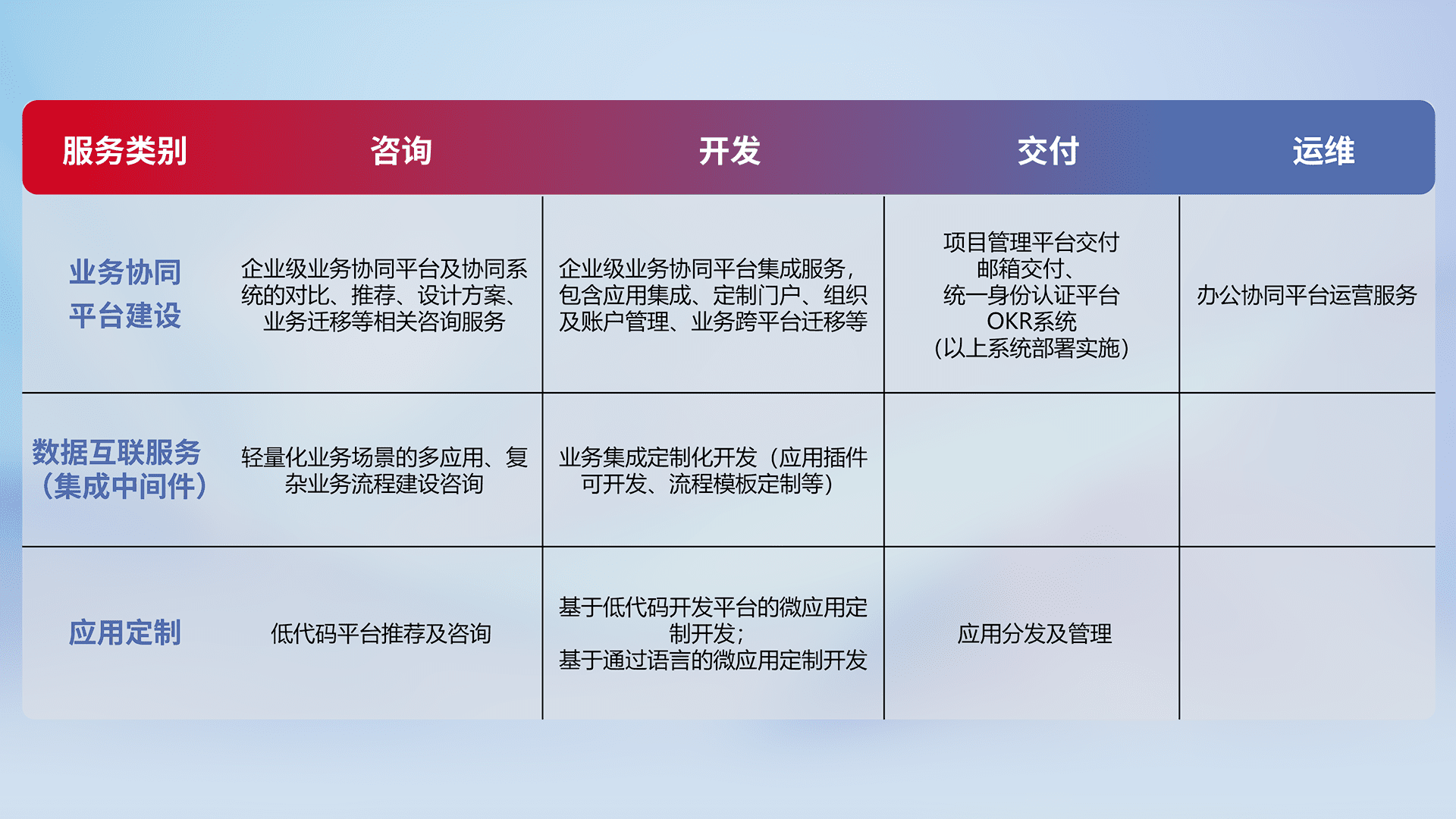 针对钉钉、、、、企微、、、、IDaas等平台级产品提供产品的规划、、、、方案、、、交付、、、、定制化开发等服务,,,实现如统一协同办公、、、智能客户服务、、、混合会议管理、、、、智能数据查询、、、等业务场景,,实现数字化转型。。
